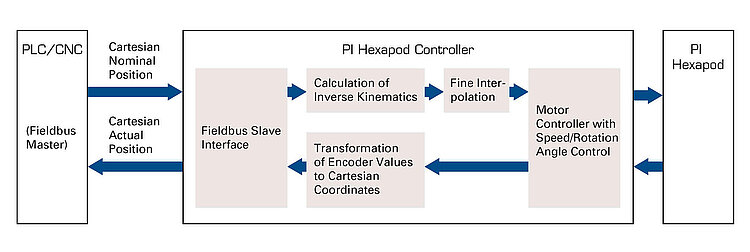 Die Positionseingabe erfolgt in kartesischen Koordinaten, aus denen der Controller die Ansteuerung der Kinematik berechnet. Um den Hexapod einfach zu integrieren, können die Koordinatensysteme (Work, Tool) geändert werden. Der Drehpunkt ist frei im Raum definierbar. Ein Datenrekorder kann Betriebsgrößen wie z. B. Motoransteuerung, Geschwindigkeit, Position oder Positionsfehler aufzeichnen. Die Ausführung von Makros und Python-Skripten auf dem Controller ermöglicht den Stand-Alone-Betrieb. Über einen externen Schalter, z. B. einen Motion-Stop-Button, kann der 24-V-Ausgang für den Hexapod aktiviert/deaktiviert werden.