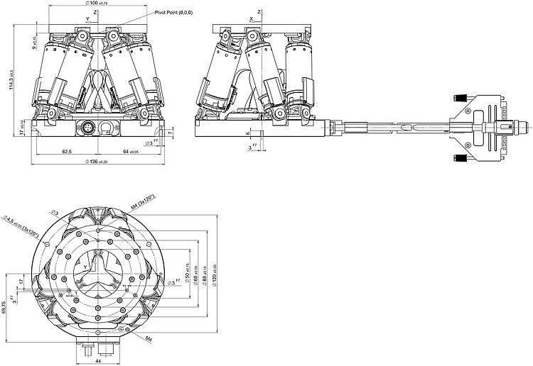 Miniatur-Hexapod; BLDC-Motor; 2,5 kg Nutzlast; 20 mm/s maximale Geschwindigkeit; 0,5 m Kabellänge. Anschlusskabel sind nicht im Lieferumfang enthalten und müssen separat bestellt werden.