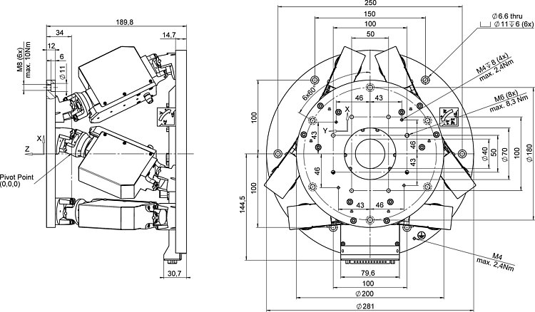 Die maximalen Stellwege der einzelnen Koordinaten (X, Y, Z, θX, θY, θZ) sind voneinander abhängig. Die Daten für jede Achse zeigen jeweils ihren maximalen Stellweg, wenn alle anderen Achsen auf der Nullposition des Nominalstellweges stehen und das werkseitige Koordinatensystem verwendet wird, beziehungsweise wenn der Pivotpunkt auf 0,0,0 gesetzt ist.