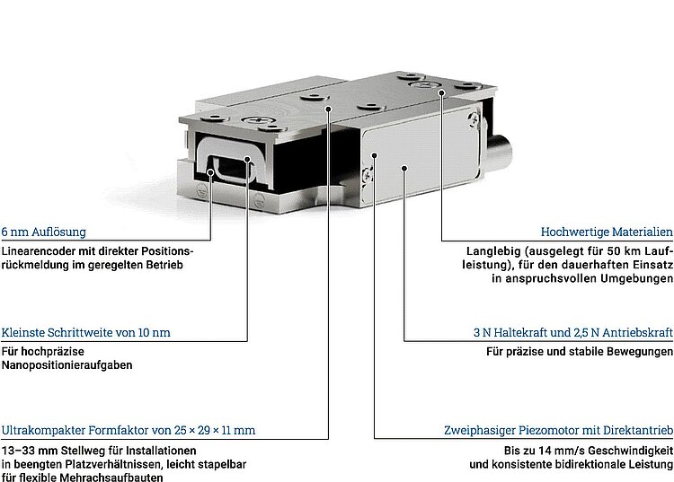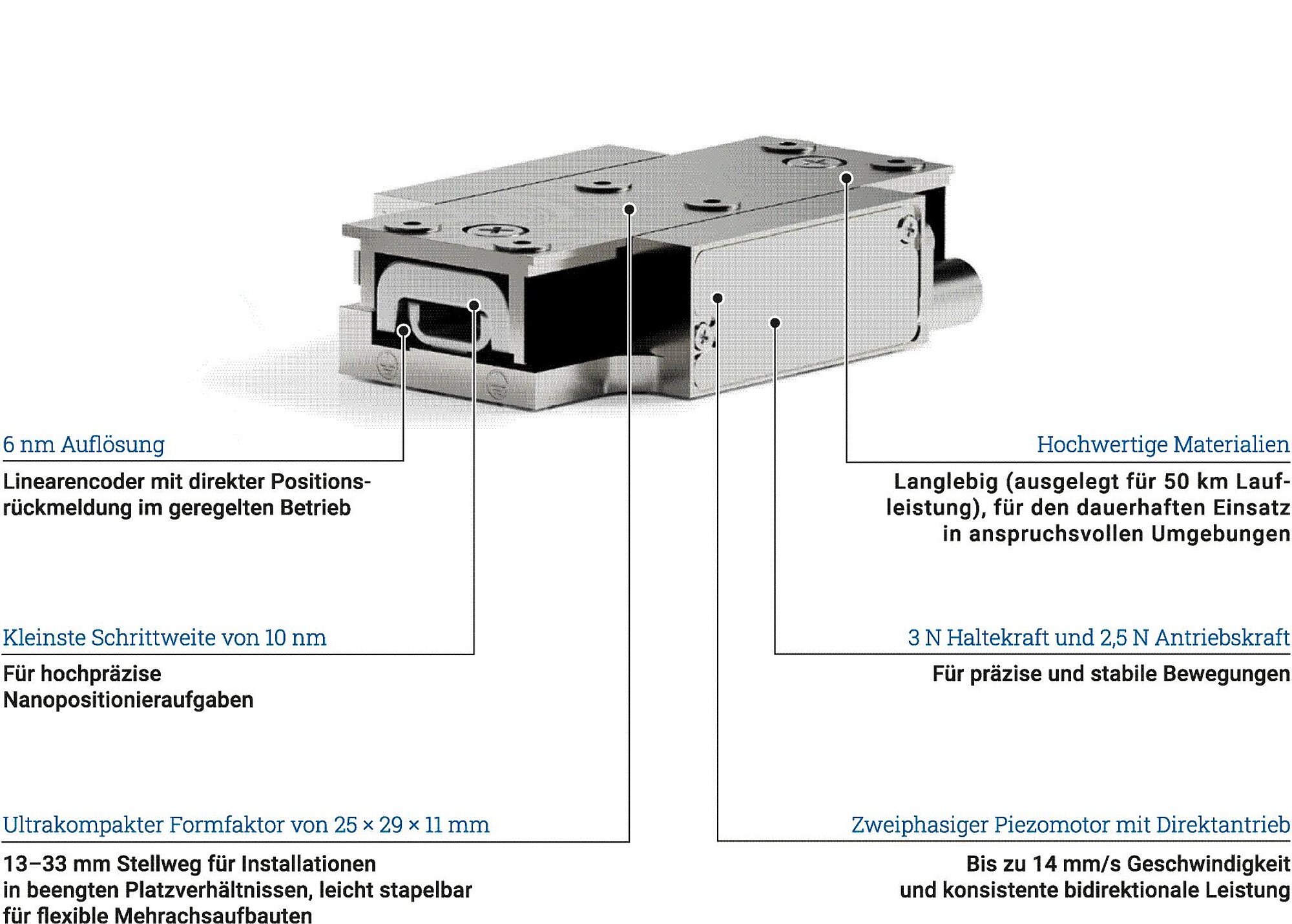 BIX Miniaturlineartisch; piezoelektrischer Trägheitsantrieb; 13 mm Stellweg; Linearencoder, 6 nm Auflösung; 2,5 N Antriebskraft; Abmessungen 25 × 29 × 11 mm (L × B × H)
