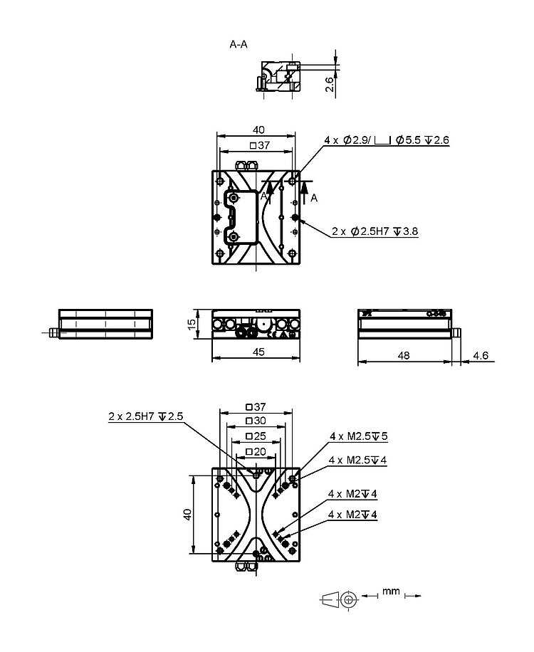 Q-Motion® Lineartisch, piezoelektrischer Trägheitsantrieb, 26 mm Stellweg, Linearencoder, 1 nm Auflösung, 7 N Antriebskraft, Abmessungen 45 × 63 × 15 mm (B × L × H)