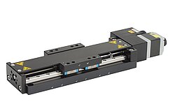 Hochlast-Lineartisch; Synchron-Servomotor bis 320 V; 407 mm Stellweg; 450 N Belastbarkeit; 300 mm/s maximale Geschwindigkeit; Kugelumlaufspindel; Inkrementeller Rotationsencoder, 20000 Impulse/U Auflösung, A/B-Quadratur, RS-422; Absoluter Linearencoder, 1 nm Sensorauflösung, EnDat 2.2; 166 mm Breite, Schleppkette
