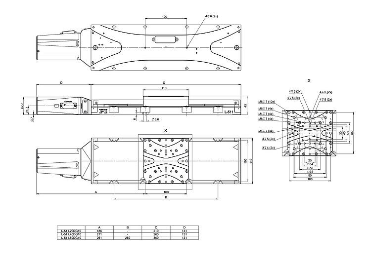 Hochpräziser Lineartisch; Bürstenloser DC-Motor; 155 mm Stellweg; 500 N Belastbarkeit; 90 mm/s maximale Geschwindigkeit; Kugelumlaufspindel; Inkrementeller Rotationsencoder, 20000 Impulse/U Auflösung, A/B-Quadratur, RS-422; Inkrementeller Linearencoder, 20 µm Sensorsignalperiode, Sin/Cos, 1 V Spitze-Spitze