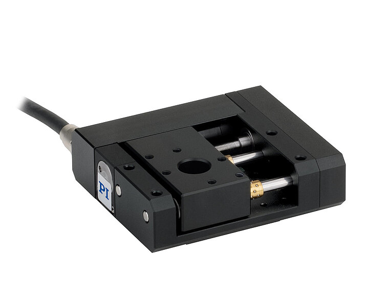 Kompakter Lineartisch; 2-Phasen-Schrittmotor; 25 mm Stellweg; 20 N Belastbarkeit; 1 mm/s maximale Geschwindigkeit; Feingewindespindel; 0,5 m Kabellänge