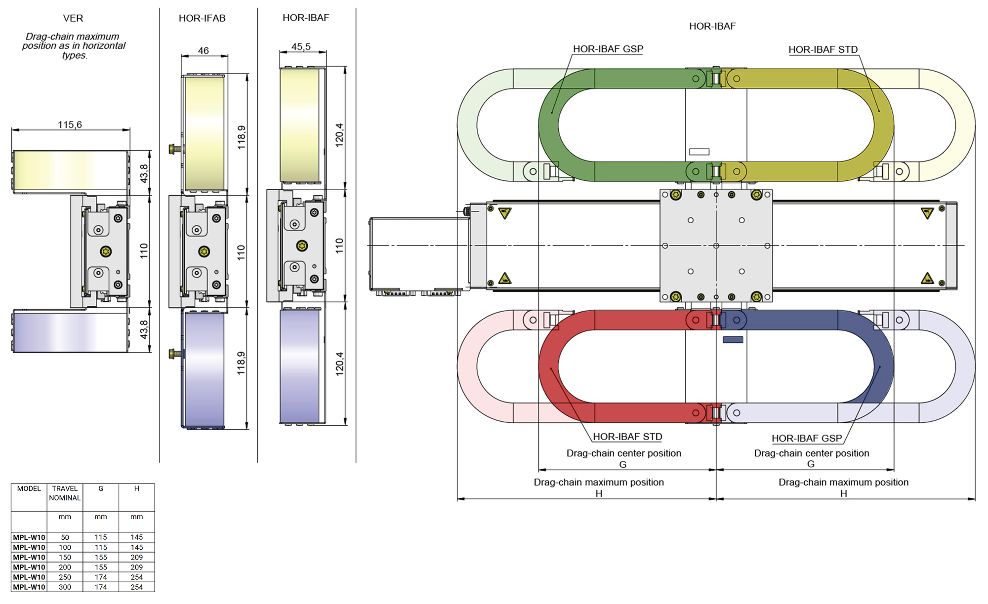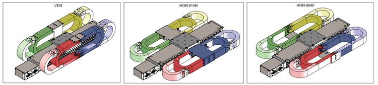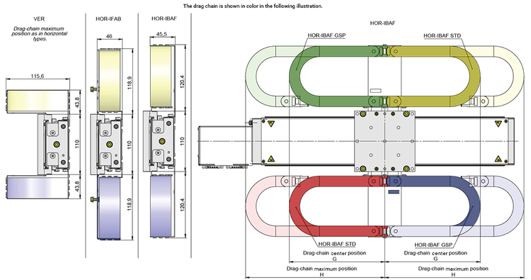 Die Schleppkette kann an acht verschiedenen Positionen am Tisch befestigt werden. Dabei handelt es sich um vier vertikale und vier horizontale Positionen. Für die horizontalen Positionen sind die folgenden zusätzlichen Varianten verfügbar: HOR-IFAB, wobei der innere Teil der Schleppkette feststehend ist und sich der äußere Teil bewegt, und HOR-IBAF, wobei sich der innere Teil bewegt und der äußere Teil feststehend ist. Die Schleppkette ist ein Zubehörteil, das vom Kunden angebracht werden kann. Die Schleppkette kann entweder an den seitlichen Nuten oder an den Spannklauen befestigt werden.