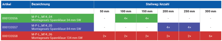 Der Montagesatz mit Spannklaue ist für alle Konfigurationsvarianten des Tisches geeignet. Er dient zur Befestigung der Achse in der Anwendungsumgebung. Die Spannklauen werden in die seitliche Nut eingeführt und mit Schrauben an der Oberfläche befestigt. Zum Lieferumfang der Spannklauen gehören Schrauben in unterschiedlichen Längen.