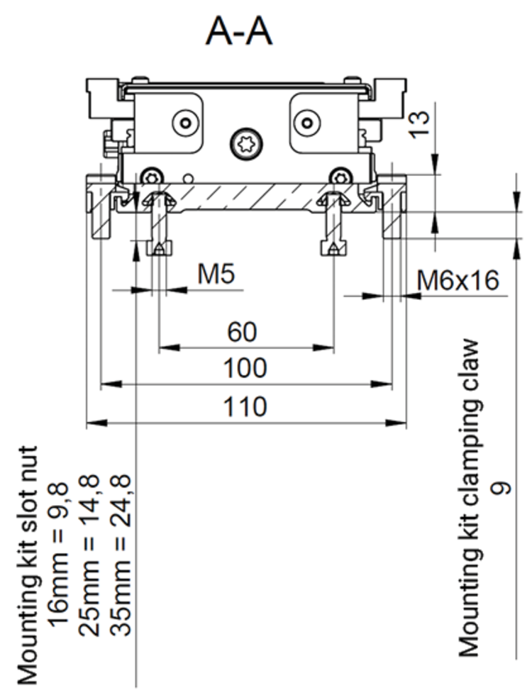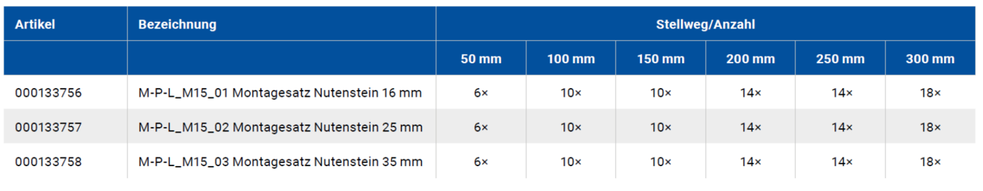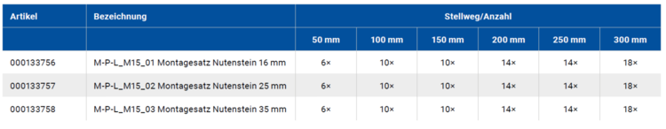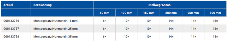 Der Montagesatz mit Nutenstein ist für alle Konfigurationsvarianten des Tisches geeignet. Er dient zur Befestigung der Achse in der Anwendungsumgebung. Die Nutensteine werden in den Nuten an der Unterseite des Tisches eingeführt und durch eine Durchgangsbohrung mit der Oberfläche verschraubt. Im Lieferumfang des Montagesatzes sind Schrauben in verschiedenen Längen enthalten.