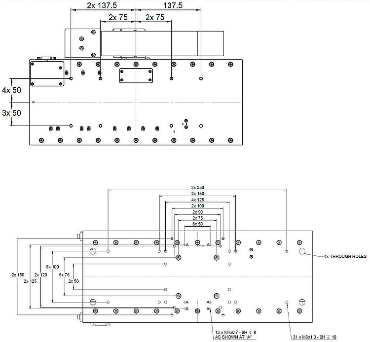 Hinweis zu Geradheits- und Winkelabweichung: Abhängig von der Qualität des Untergrunds, der Nutzlast, der Ausrichtung und von Kräften, die von außen auf den Tisch wirken. Kontaktieren Sie PI für anwendungsspezifische Parameter. Die angegebenen Werte sind statisch (keine Rotationsbewegung während der Messung) und ohne Last.