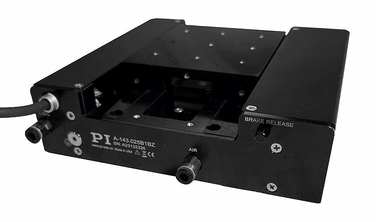 PIglide Miniatur-Lineartisch mit Luftlager; Eisenloser 3-Phasen-Linearmotor; 25 mm Stellweg; 40 N Belastbarkeit; 390 mm/s maximale Geschwindigkeit; Absoluter Linearencoder, 1 nm Sensorauflösung, BiSS-C; Elektromagnetische Haltebremse; Pneumatisches Gegengewicht; 0,5 m Kabellänge