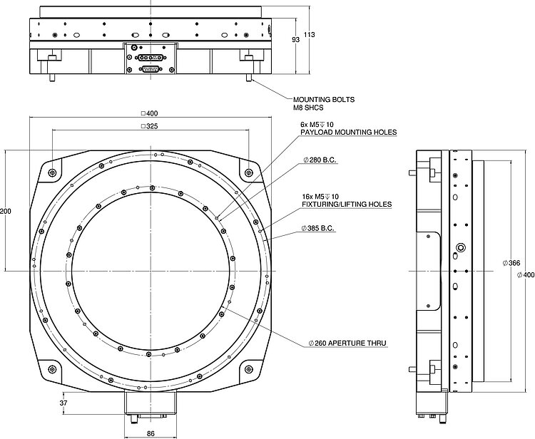 - Durchmesser Bewegungsplattform 365 mm, Durchmesser Apertur 260 mm