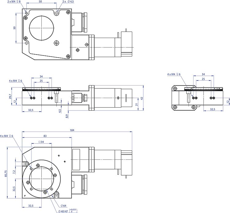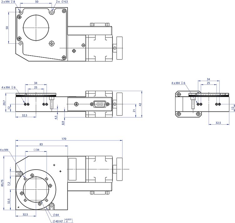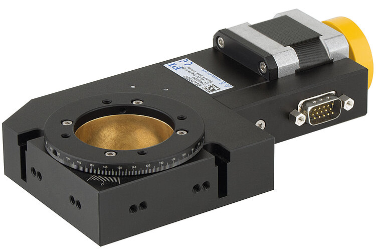 Schneckenantrieb mit hoher Untersetzung für präzise Positionierung. Große Apertur mit 40 mm Ø. Mechanischer Referenzschalter.