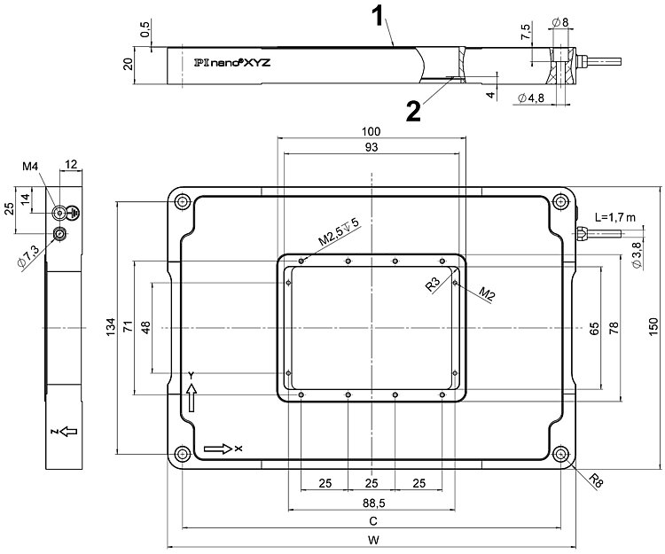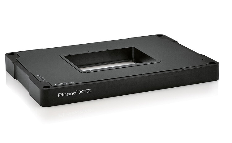 PInano® Trak XYZ-Piezotrackingsystem; freie Apertur für Objektträger; 70 µm × 70 µm × 50 µm Stellweg (X × Y × Z); Direktantrieb; piezoresistiv, indirekte Positionsmessung; D-Sub 37 (m)-Stecker; 1,7 m Kabellänge; mit USB-Digitalcontroller