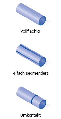 Elektrodendesigns | Neben mehrfach segmentierten Rohren sind weitere Designs möglich, wie vollflächig, 4-fach segmentiert oder Umkontakt (siehe rechte Spalte). |