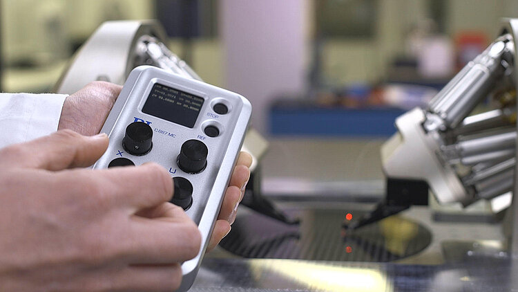 Mit der manuellen Bedieneinheit C-887.MC2 können Achsbewegungen gestartet und gestoppt werden. Dazu wird C-887.MC2 entweder an einen C-887.5xx[0] Hexapod-Controller oder an einen PC angeschlossen.