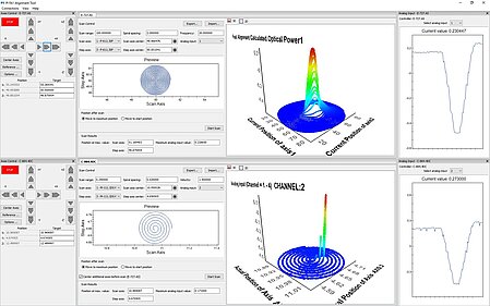 Einige unserer leistungsfähigeren Controller bieten die Möglichkeit mehrere Scan- und Alignment-Routinen auszuführen, z. B. für Anwendungen der optischen Faserjustage. Diese können mit den Scan- und Alignment-Funktionen in PIMikroMove® konfiguriert und an den Controller transferiert werden und dann über die API-Funktionen oder falls nötig mit der GUI gestartet werden. Die Ausführung auf dem Controller stellt eine hohe Performance sicher und ermöglicht eine einfache Integration über unsere Treiber und der API.
